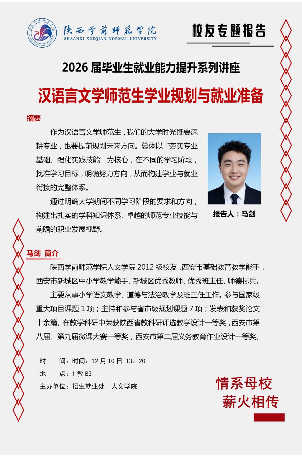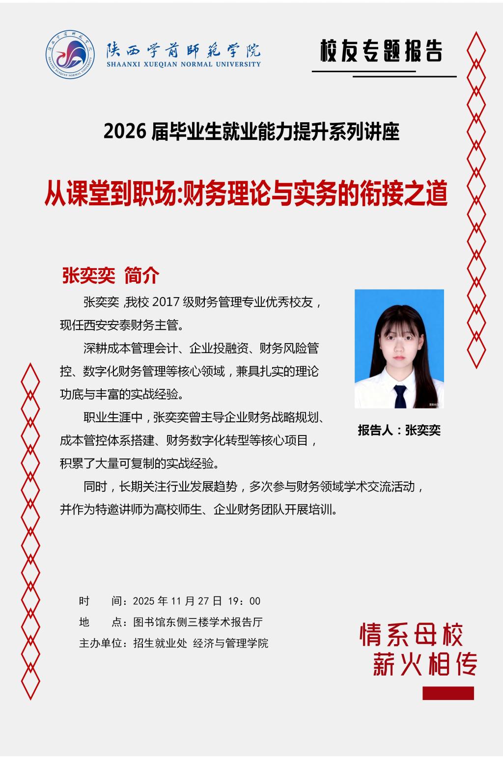为搭建校企人才精准对接桥梁,帮助2026届毕业生明晰就业方向、提升简历制作与面试实战能力,近日,招生就业处联合教育科学学院特邀陕西佳诚人才集团有限公司在积学楼B1教室举办校友单位专场就业指导讲座。教育科学学院2026届140余人参加讲座。 教育科学学院2006级校友、陕西佳诚人才集团有限公司总经理张雷委派公司人事经理童佳以“简历优化与面试”为主题为教育科学学院的学子开展专题就业指导。童佳结合自身人力资源从业经验...