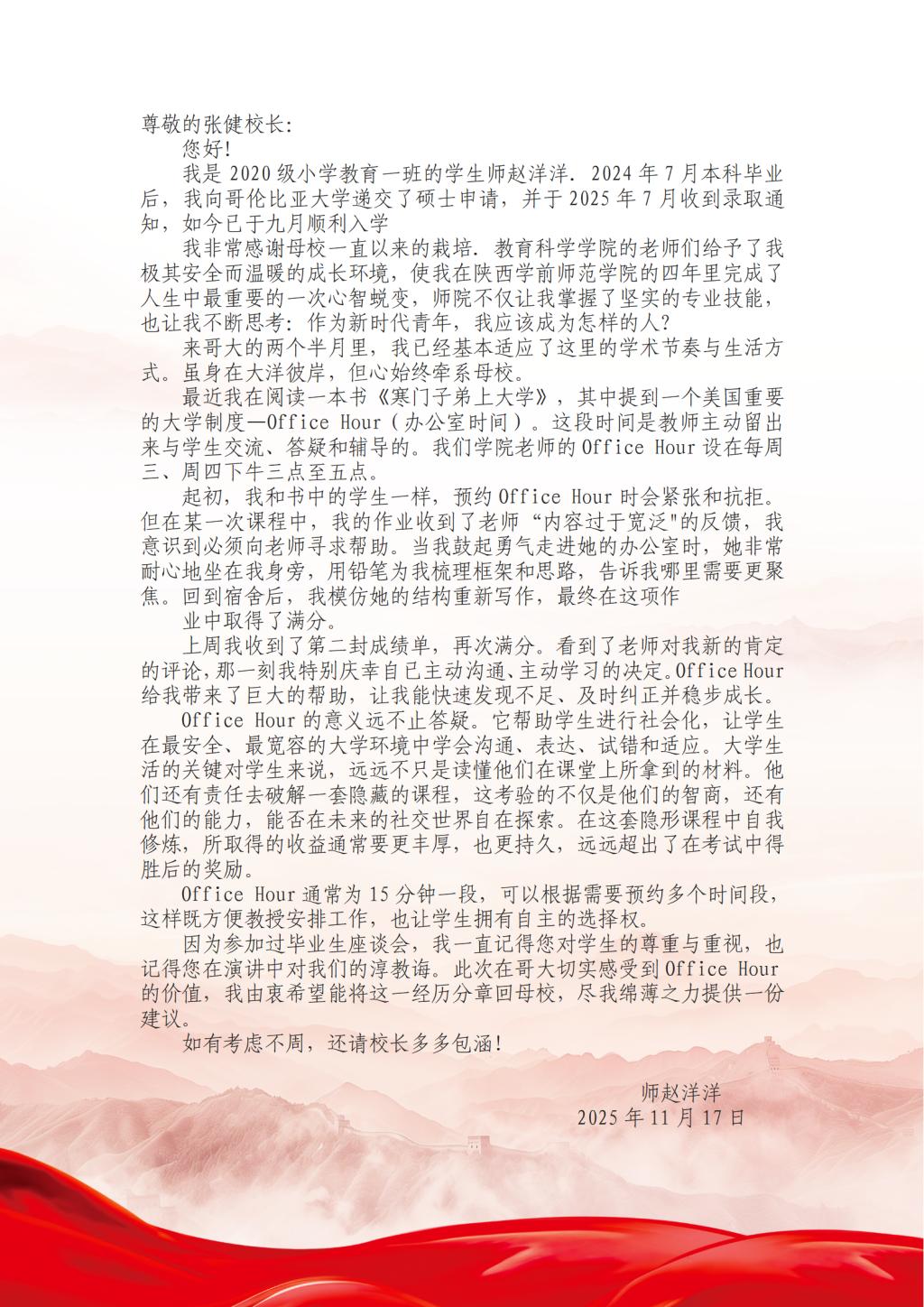 近日,我校2024届校友师赵洋洋从哥伦比亚大学向母校致信,分享海外求学感悟,并真挚推荐了促进师生深度交流的“Office Hour”制度。学校党委书记、校长张健亲自回信,感谢其心系母校的深情厚谊,并表示已将其建议转交相关部门研究落实,探索搭建更加畅通的师生沟通桥梁。