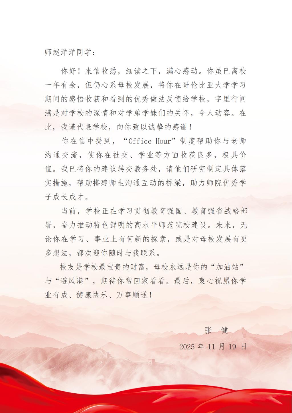 张健在回信中强调,校友是学校最宝贵的财富,母校永远是学子温暖的港湾和坚实的后盾。他祝愿师赵洋洋校友学业有成,并欢迎她常与母校联系。一纸书信,承载着校友的赤子之心与母校的深切关怀。