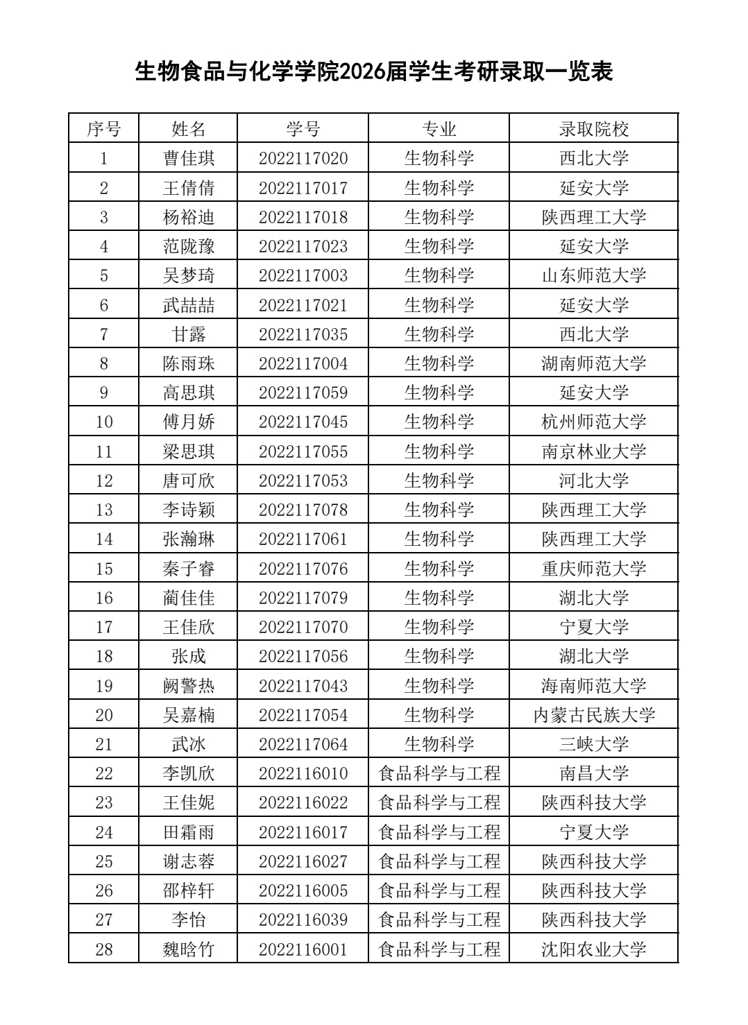 近日,生物食品与化学学院2026届本科生考研升学捷报频传,56名学子成功斩获硕士研究生拟录取资格。在毕业生规模保持稳定的前提下,较上一届40人的录取人数增加16人,增幅达40%,升学数量与质量均实现了提升。这是生物食品与化学学院深耕人才培养、创新育人模式、精准助力考研的全面体现,彰显出扎实的育人功底与显著成效。