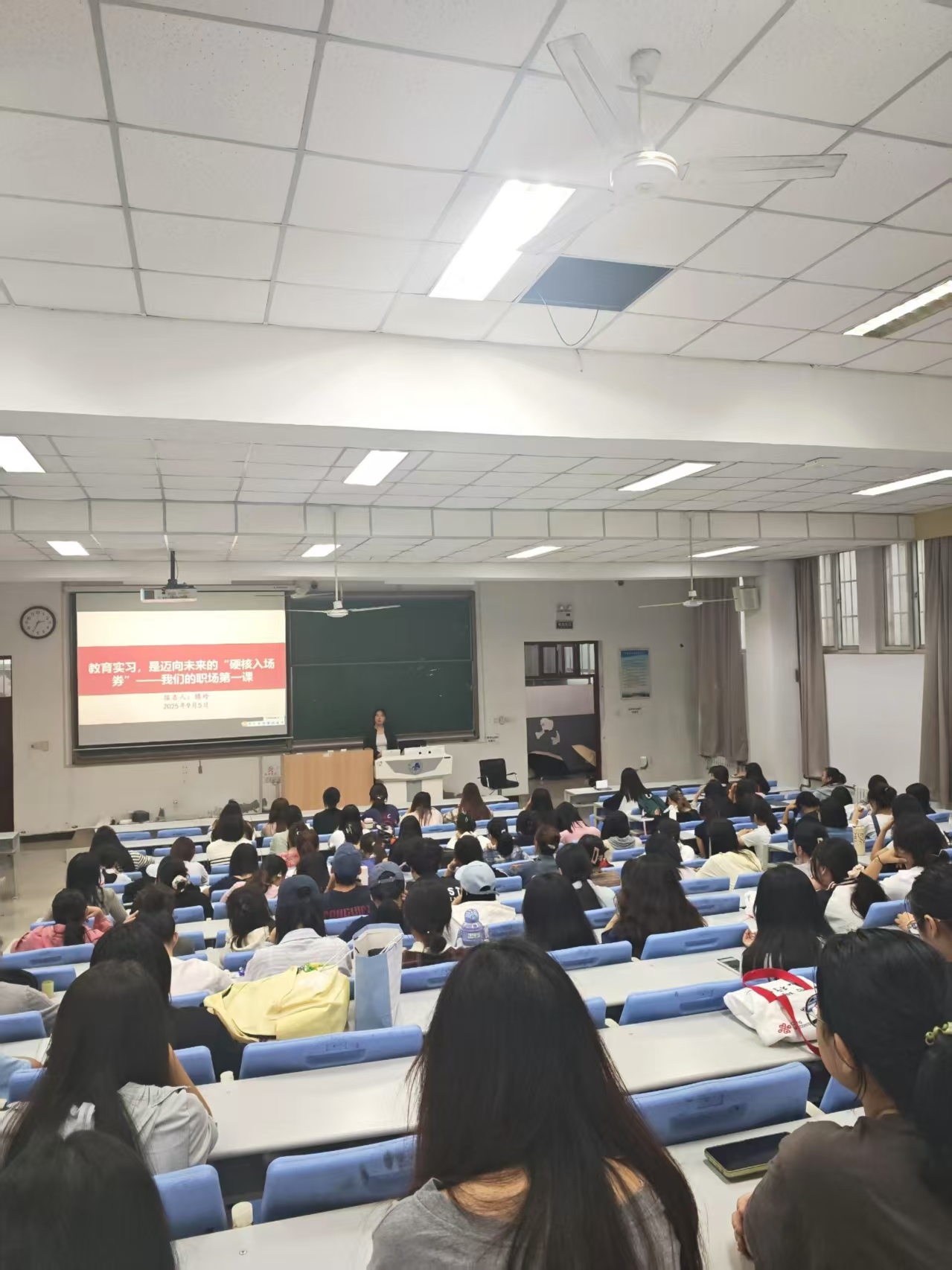 9月5日下午,招生就业处联合教育科学学院邀请2014级小学教育优秀校友、西安市曲江第五小学一级语文教师兼班主任滕玲在博文楼A1开展“教育实习,迈向未来的“硬核”入场券—我们职场的第一课”的专题讲座。本次活动由招生就业处就业科科长主持,教育科学学院150余名2026届毕业生积极参加。