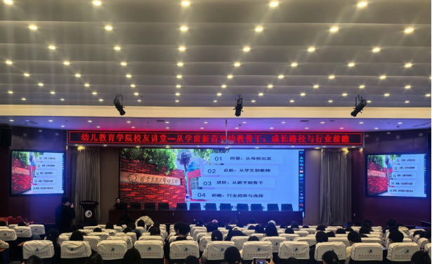 2025年12月17日,陕西学前师范学院幼儿教育学院校友讲堂在图书馆东侧报告厅召开。本次讲座聚焦专业成长与职业发展,以“从学前新苗到幼教骨干:成长路径与行业前瞻”为主题,特邀西安交通大学幼儿园优秀校友艾玥玥回校分享,幼儿教育学院党委副书记苏群、职业生涯规划课教师白雪祺、2024级学前教育本科全体同学参与。